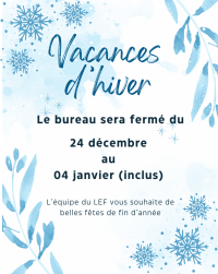 L'acceuil sera fermé du 24 décembre au 04 janvier inclus. Réouverture le 05 janvier à 9h. L'équipe du LEF vou[...]